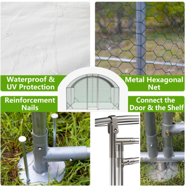 This heavy-duty chicken coop provides a large, comfortable, and safe space for your pets, whether they are chickens, ducks, rabbits or cats, dogs, or bamboo rats. Built with robust steel tubes, an extra thick tarp, and durable wire mesh, this chicken run is an ideal setting for raising animals all year round. The galvanized steel pipe used to construct the chicken cage greatly improves the rust resistance of the cage, giving it a longer life than other products. The walls of the chicken cage are made of PVC-coated hexagonal metal mesh, which is strong and durable, and not easily damaged. The chicken coop tarp is removable, so you can have the option of letting the animals enjoy the warmth of the sun as well as avoiding rain, snow, and excessive UV rays. Don't hesitate, this sturdy and durable chicken cage will become your animals' new favorite place!