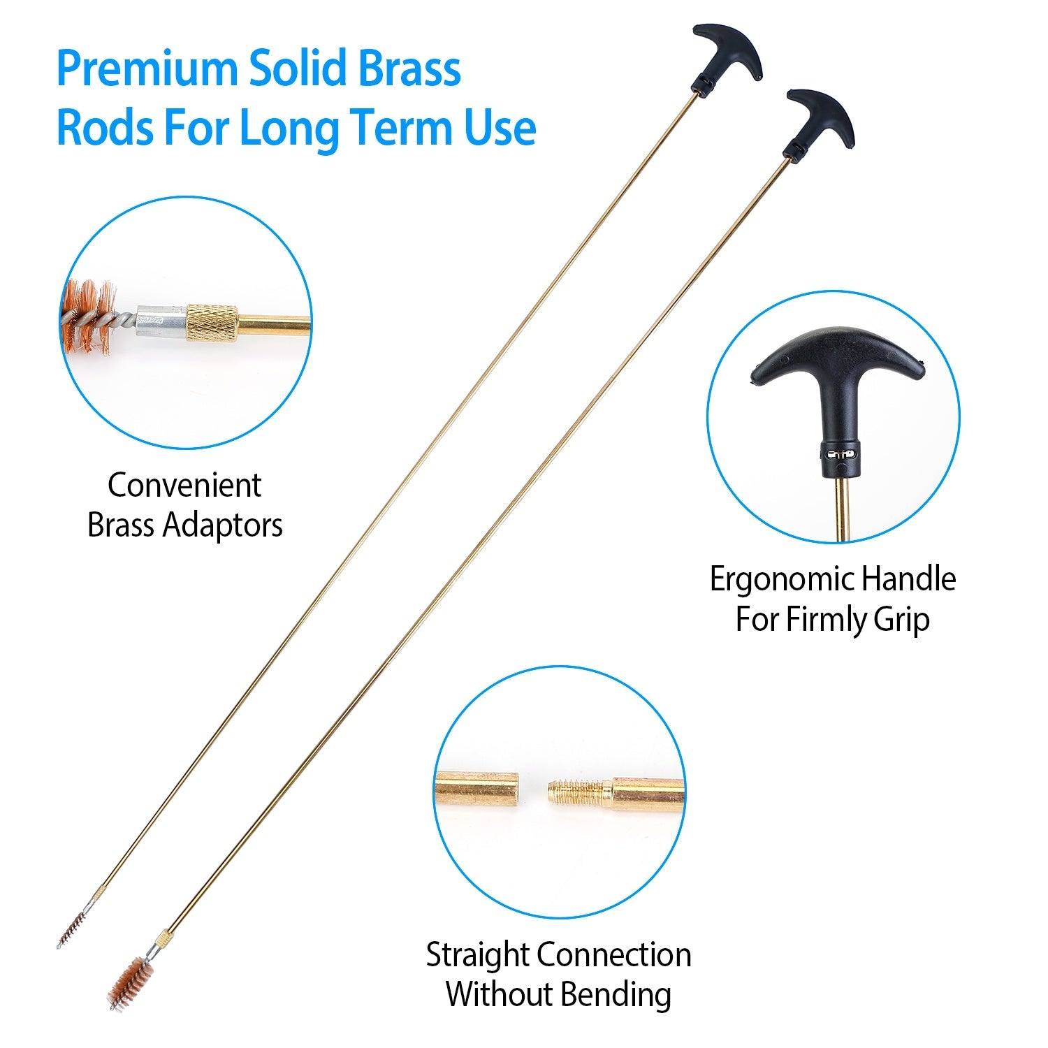 - **Sturdy and Reliable*: The handles in our gun cleaning kit are made from hardened plastic and adopts ergonomic design which provide a comfortable hand-feel when you are cleaning the inside of your gun. The cleaning mops adopt premium cotton fabric materials which will remove debris from the inside of your gun. And the wire brushes adopt sturdy brass materials which can help you remove stubborn debris efficiently.