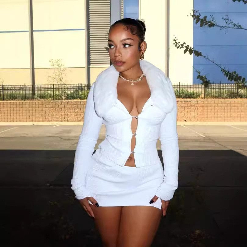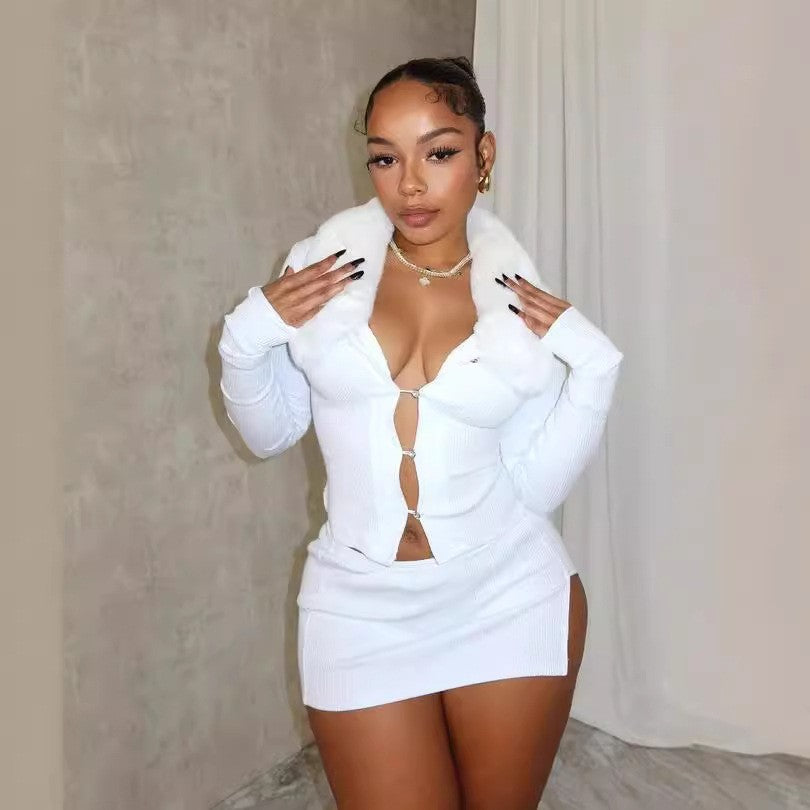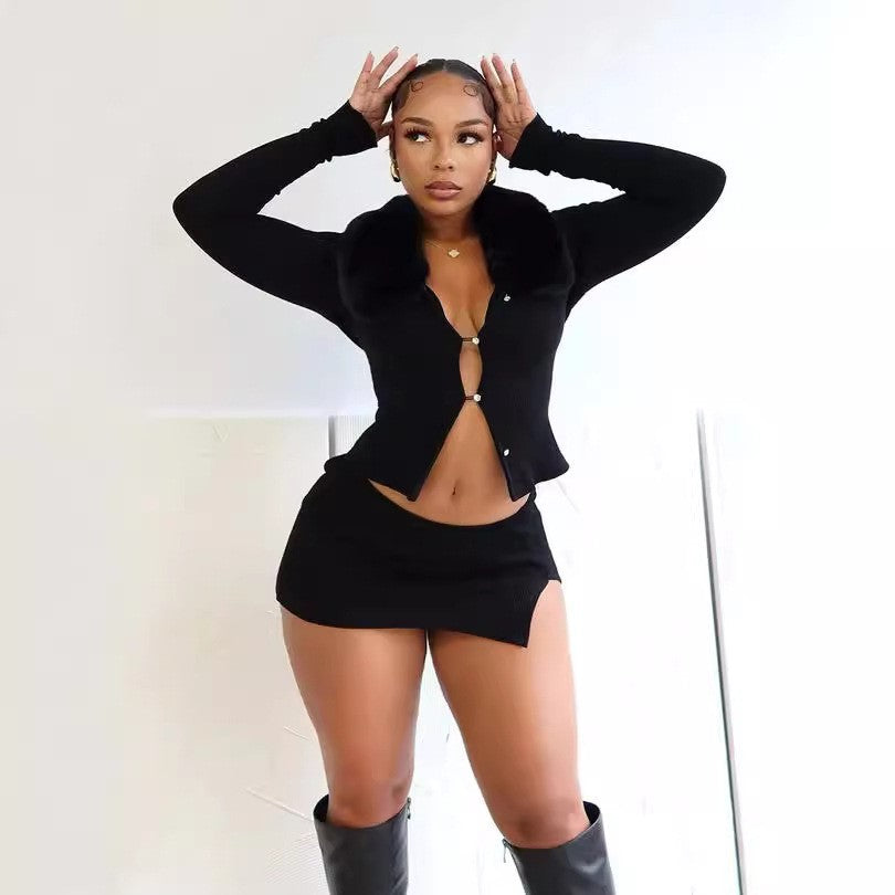Fur Collar Hollow Out Button Long Sleeve Top Split Skirt Suit