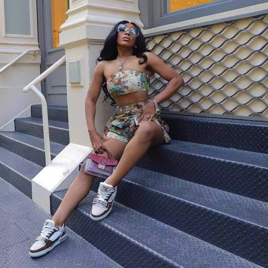 Vintage Flower French Court Tube Top Tassel Suspender Shorts Suit